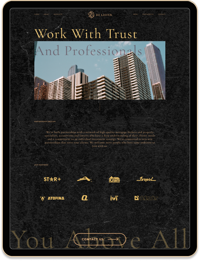 Bi Lions Finance is an Australian-owned, based and regulated non-bank lender and mortgage manager. Inspired by the brand name, we used thick and thin lines and strokes, combined with the founder's initials to create the logo of the lion silhouette, and determined the color tone of black marble and light gold, adding a stable and reliable brand image to the entire design. Strokes of different golden pigments are used throughout the site to match the brand shades.